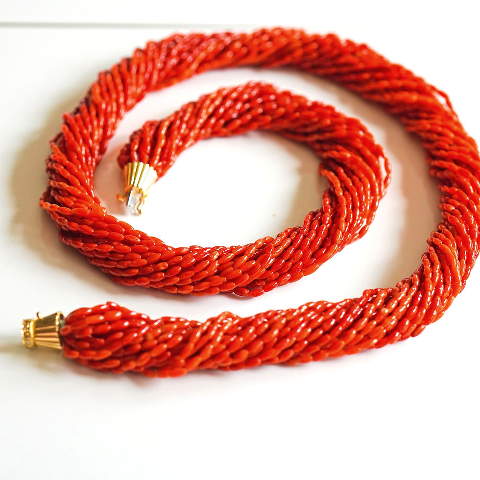 Coral is developed deep in the ocean and originates from living organisms, called coral polyps. They come in many colours; reds, pinks and oranges which are the most popular and sought after.